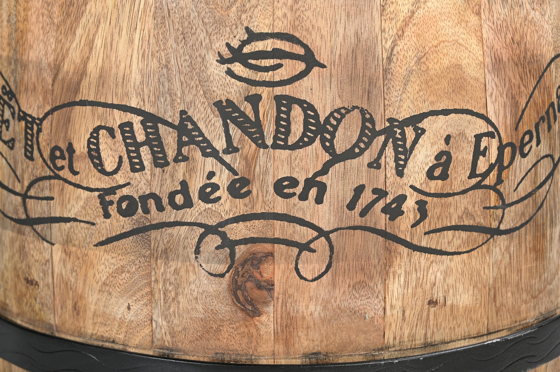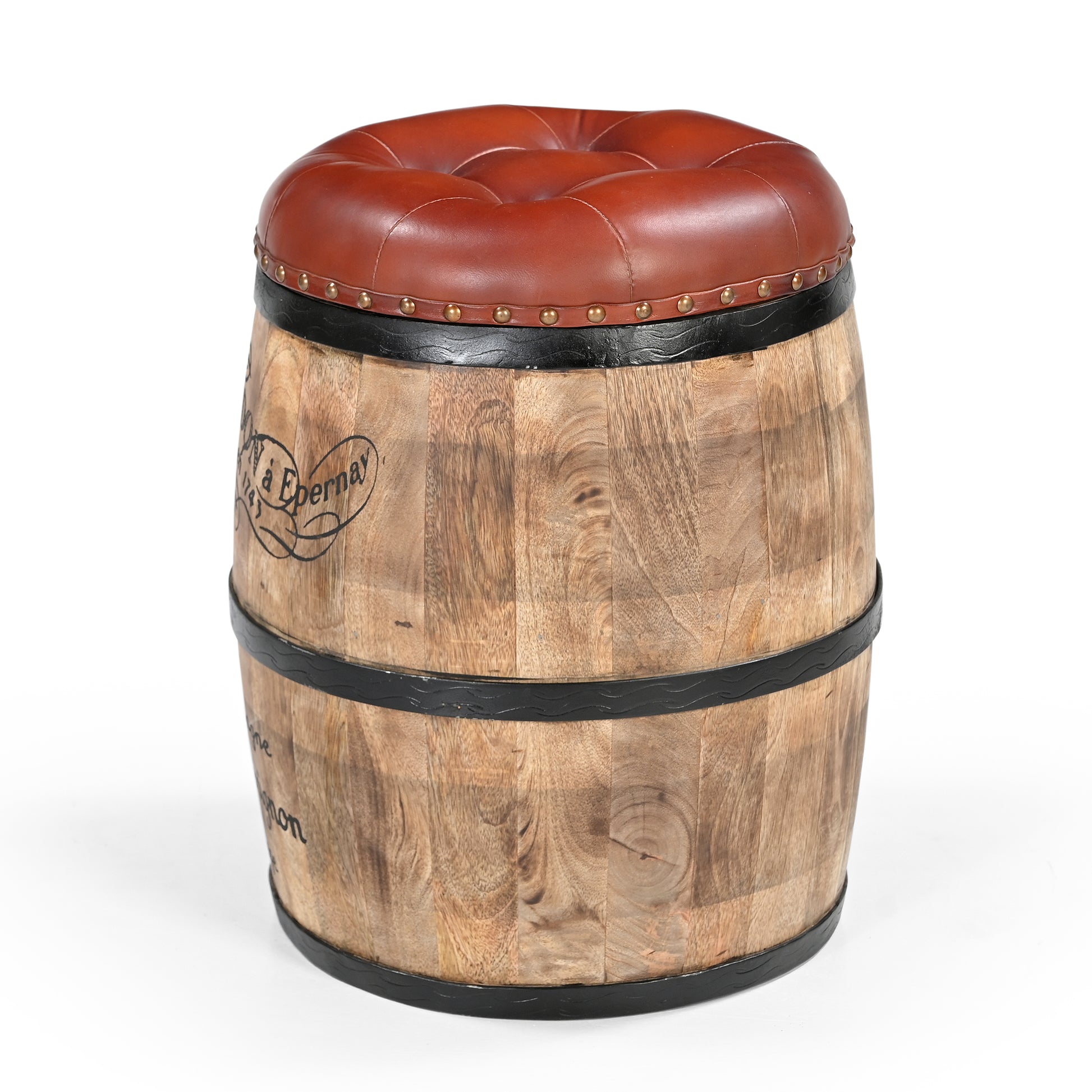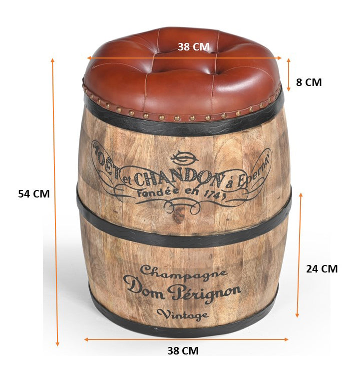 Wood and leather are an inspired combination in our French Vintage Champagne Leather Top Ottoman. The cylindrical shaped ottoman features an exquisite leather mushroom style seat top, with a slightly barrelled wooden base that includes a vintage French Champagne house motif. This is the perfect addition to your French vintage inspired space. Top open for storage